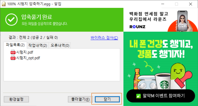 압축 풀기가 완료되었습니다. <닫기>를 누릅니다.