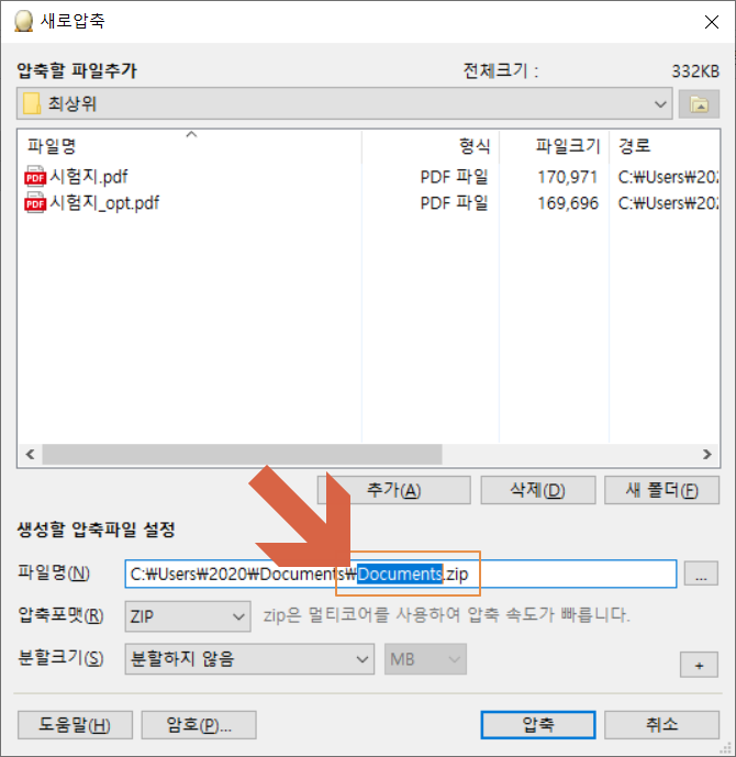 새로 압축창이 열리고 파일명에 압축될 파일의 명칭을 입력합니다.