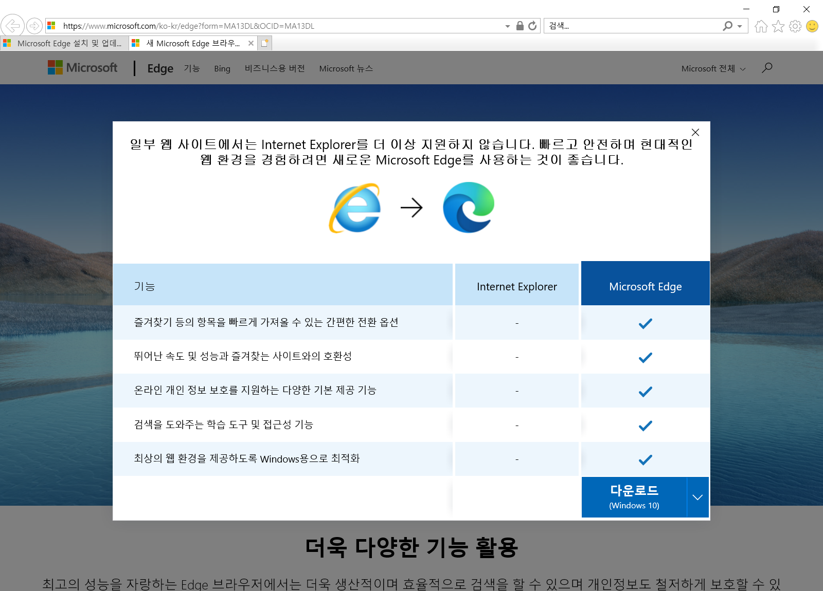 새로운 마이크로소프트 엣지(Edge) 브라우저 다운로드하시려면 여기를 참조하세요.