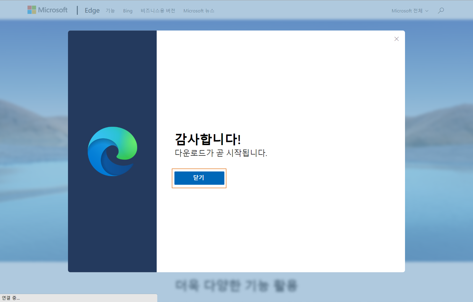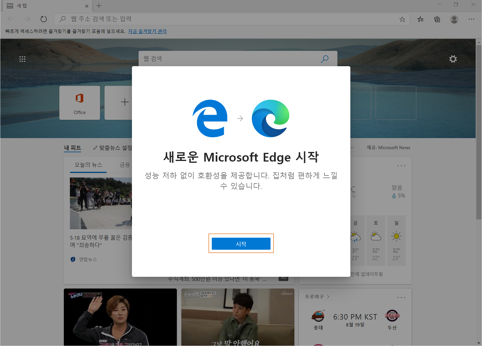 마이크로소프트 엣지(Edge)가 설치 완료되었습니다. <시작>을 누릅니다.