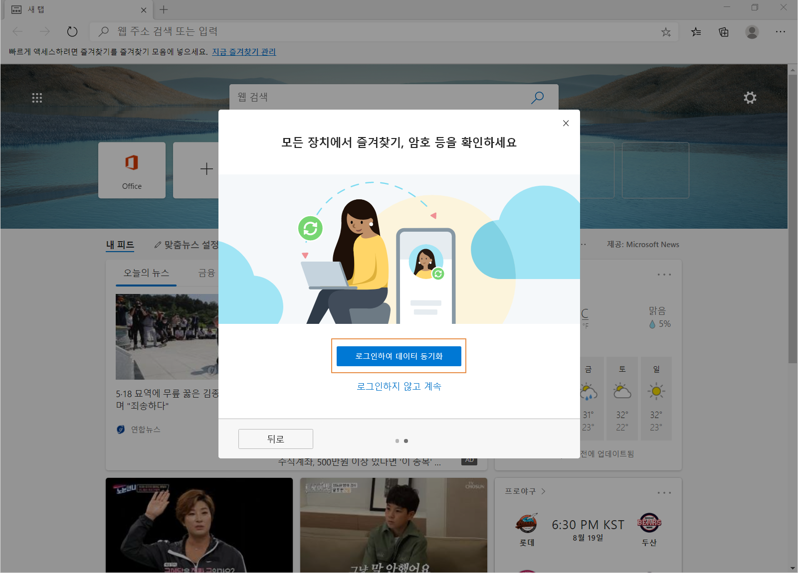 이제 기존에 사용하던 즐겨찾기와 사용자 계정 암호 등을 동기화하여 편리하게 사용이 가능해집니다. <확인>을 누르세요.