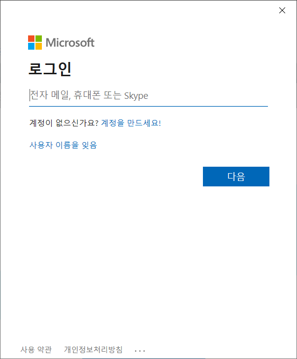 마이크로소프트 계정을 선택 후 <계속을 누릅니다.