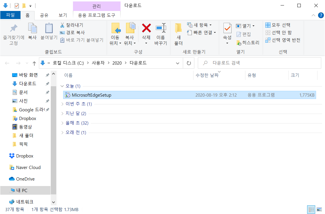다운로드 폴더로 이동하면 마이크로소프트 엣지(Edge) 설치 프로그램이 보입니다. 설치 파일을 실행합니다.