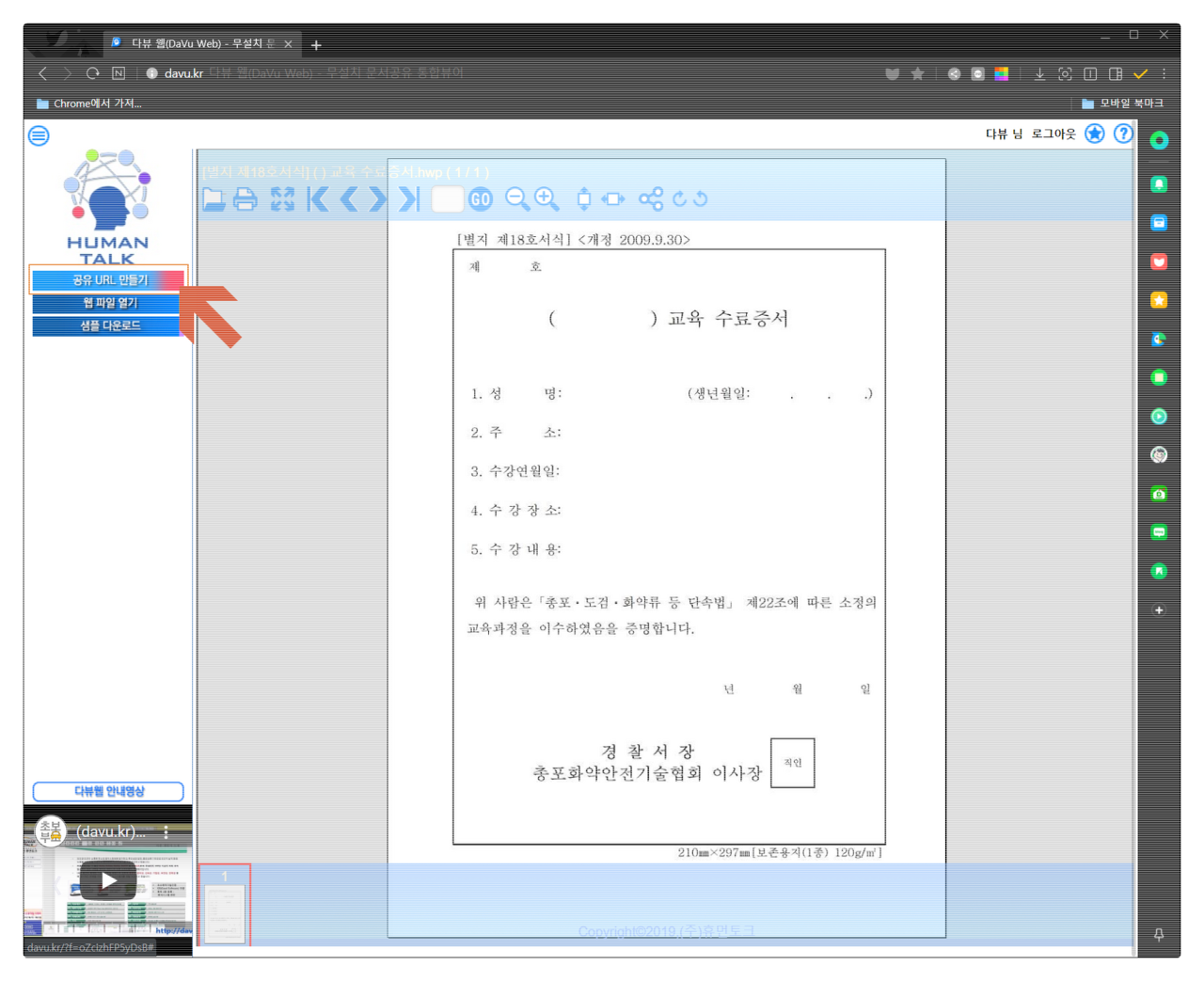 이제는 열린 파일을 다른 사용자에게 보내서 공유할 수 있도록 하겠습니다. <공유URL 만들기>를 눌러줍니다.