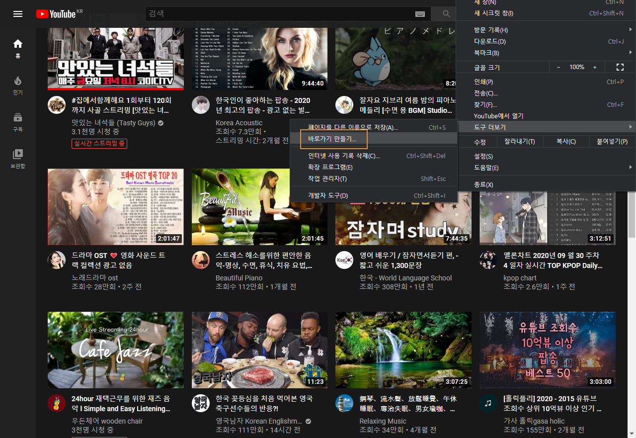 <만들기>를 누르면 바탕화면에 유튜브 홈페이지 단축 아이콘이 생성됩니다.
