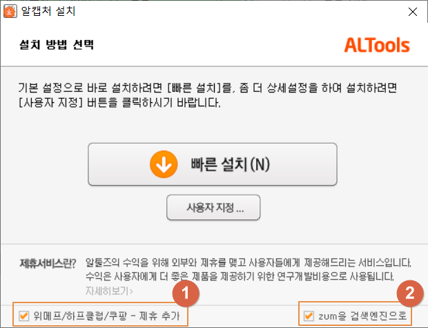 1번 <알집 추가 설치>를 체크 해제하고, 2번 <알씨 추가 설치>를 체크 해제합니다.