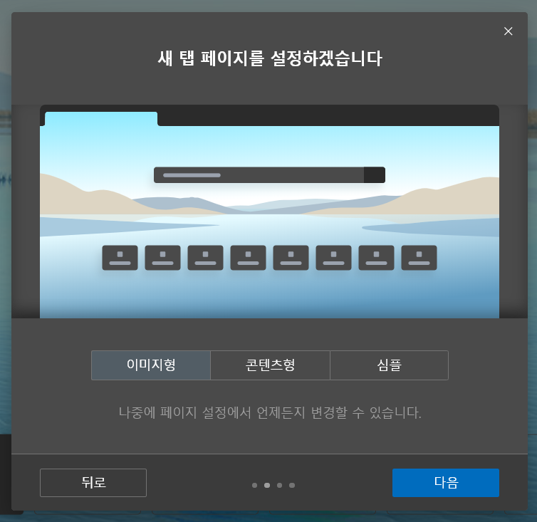 엣지를 실행시키면 첫 페이지를 설정하는 단계입니다.