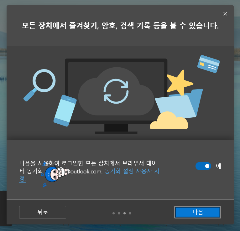 마이크로소프트 계정에 로그인하면 각종 기기들과 동기화되어 유연하게 장치를 옮겨가면서 사용하여도 일관된 환경을 유지하여 편리합니다. 구글의 크롬이나 네이버의 웨일도 마찬가지로 가능한 부분입니다.