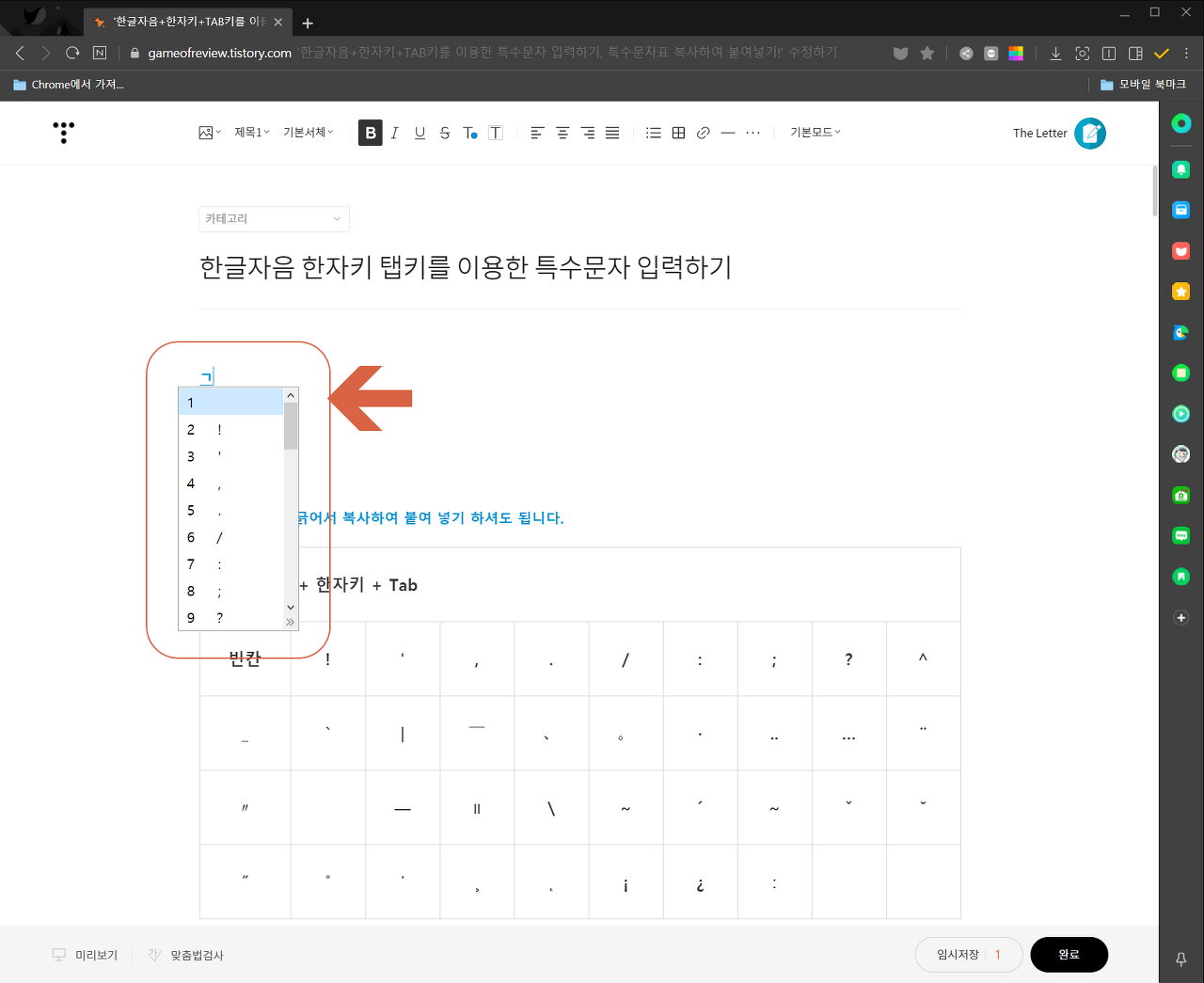 단지 한글자음과 한자키로만 사용을 했었는데, 탭키(TAB)를 추가하면 한눈에 확인할 수 있도록 가로로 펼쳐져서 한결 특수문자를 고르기 수월하게 됩니다.