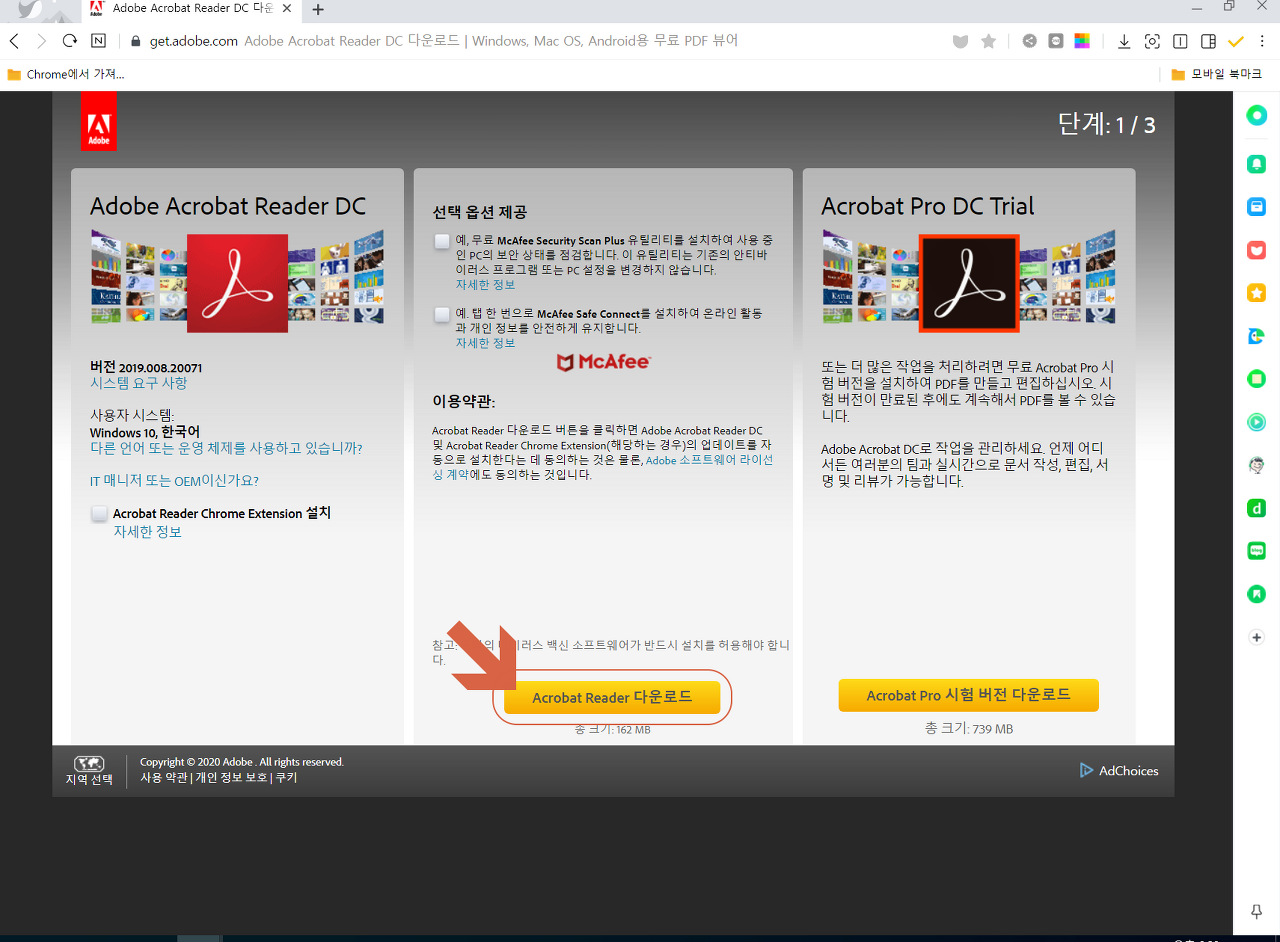 Adobe Acrobat Reader DC 다운로드 페이지에 접속합니다.